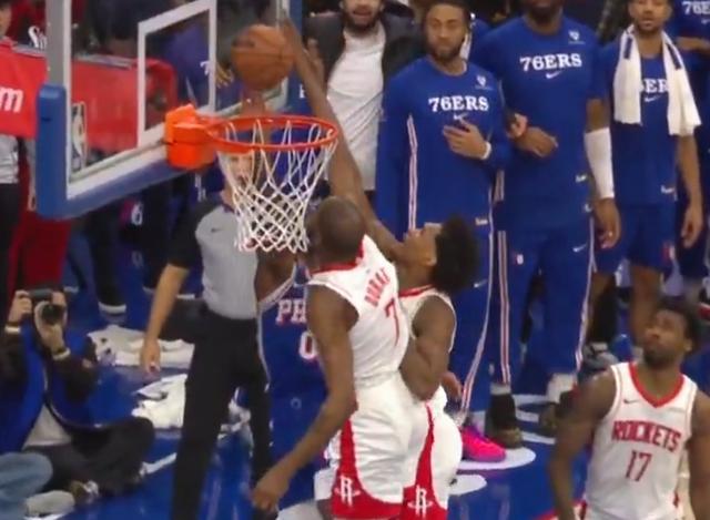 比赛末节最后时刻,双方115-115战平,76人后卫马克西持球突破冲进内线完成上篮,在篮球触碰到篮板后,火箭前锋杜兰特再次触碰篮球,按照规则应该是干扰球违例,但裁判并未吹罚。