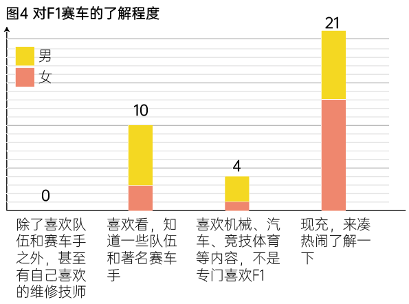 在对F1的了解程度以及参与相关体育活动上,六成受访者都是“现充”,即匆匆了解。在问及对F1的了解程度上,21人(60%)的回答是“过来凑热闹,了解一下”,4人(11.4,女1男3)喜欢的是机械、工业设计、竞技体育等,不是专门喜欢赛车(图4)。在“自己喜欢参与赛车类比赛或游戏吗”的问题上,22人(62.9%)的回答是没有特别兴趣,2位女性(5.7%)是因为孩子喜欢而陪同。