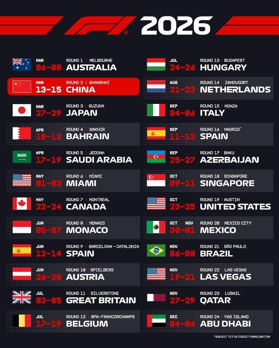 世界一级方程式锦标赛(F1)官方公布的2026年的比赛日程。图片源于F1官网。